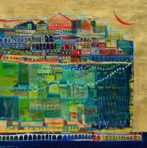Discover Vinita Karim, a renowned modern Indian artist whose dynamic journey spans over 15 cities across Europe, Asia, and the Middle East. With 27 solo exhibitions globally, including prestigious showcases like the India Art Fair and Dhaka Art Summit, Karim’s vibrant artworks resonate on an international scale. Karim’s paintings uniquely blend cultural influences into a cohesive visual language, drawing inspiration from her multicultural background and extensive travels. Her canvases vividly portray urban landscapes that merge reality with imagination, featuring a maximalist aesthetic with metallic sheens, intricate motifs, and a palette of vibrant blues, earthy tones, and rich golds.