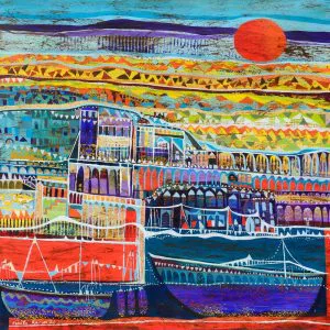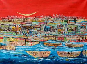 In this painting, large boats rest at the lower edge, illuminated by lights and adorned with colorful pennants. Above them stretches the port area where they are docked, blending seamlessly with the bureaucratic hub of the city, distinct yet interconnected with its residential quarters. Vinita Karim skillfully navigates the complexity, finding order within the bustling scene, perhaps drawing from her intimate familiarity with this imagined community where she appears to be a resident like no other.