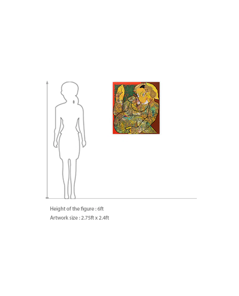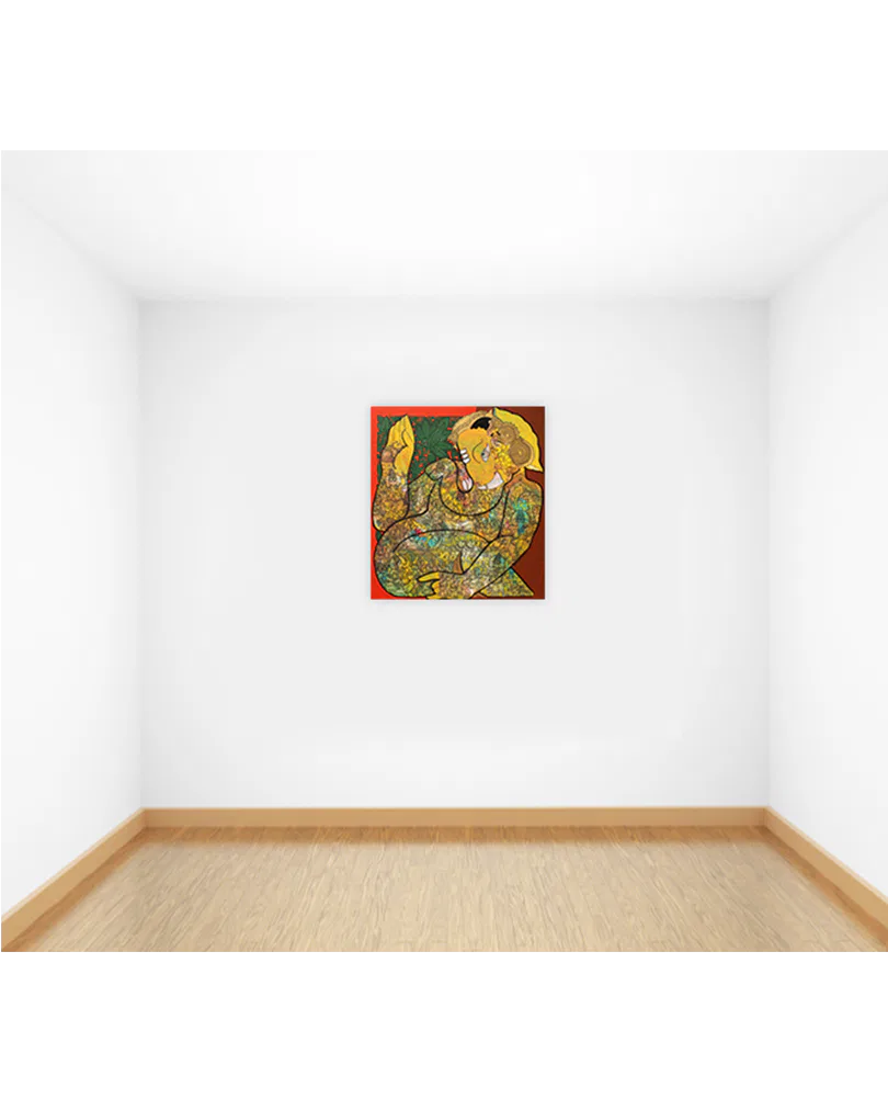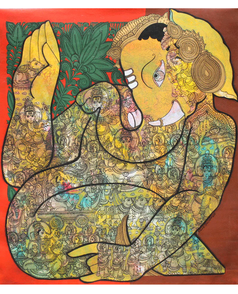 Ramesh Gorjala was born in Srikalahasti, Andhra Pradesh in 1979. He received his Bachelor’s degree in painting from Jawaharlal Nehru Technological University, Hyderabad. Gorjala works with a delicate and intricate technique, portraying his spiritual take on the subjects of Indian mythology through both his imagery and his process. His use of a palette dominated by gold, red and green creates a very rich and natural feel in each of his paintings, and the moods that he is able to create and convey add an antiquated yet contemporary dynamic to his work. His subjects are mainly the Gods, Goddesses and mythical forms of the South Asian pantheon, including Hanuman, Vishnu and Buddha, and are all painted with great sensitivity and attention to detail. Another signature element in his work is the checkerboard pattern of black and shades of white and grey in the background, adding a modern twist to pieces that have a largely traditional and spiritual feel. The artist has held many solo exhibitions and participated in various group shows in India and abroad.