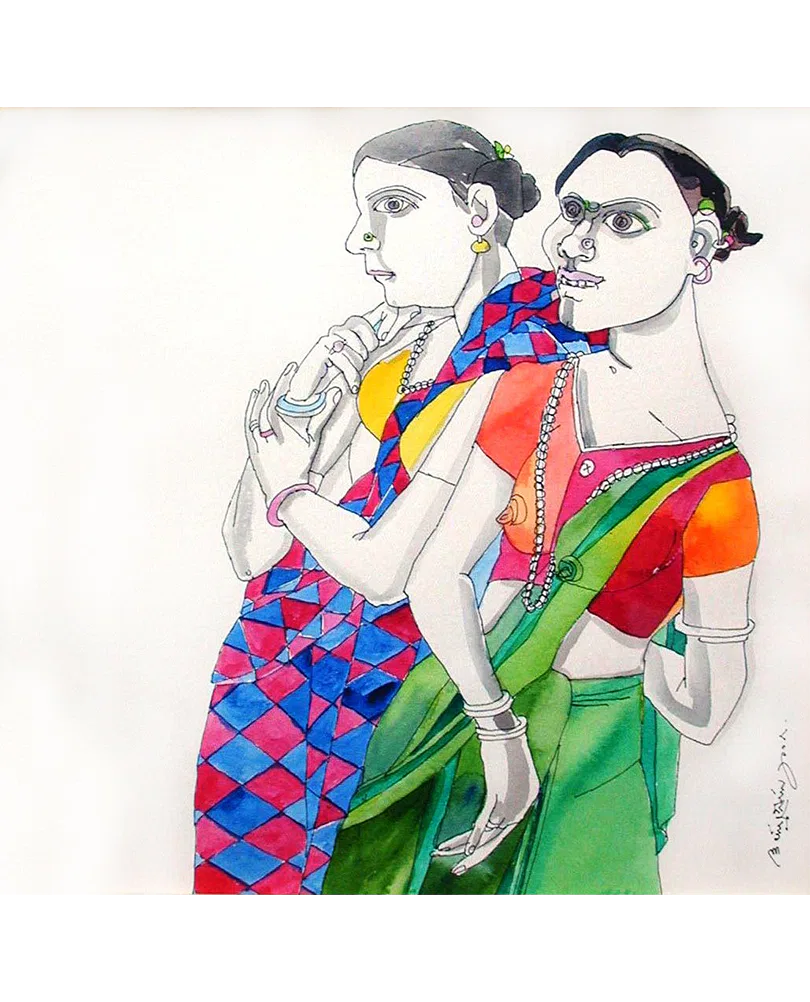 Kalal Laxma Goud is a master draughtsman with a versatility over a range of mediums, from printmaking, drawing, watercolour, gouache and pastels to glass painting and sculptures in bronze and terracotta. Goud’s artworks are rustic, raw, and potent. Goud displays versatility over a range of mediums, from printmaking, drawing, watercolour, gouache and pastels to glass painting and sculpture in bronze and terracotta. Goud’s work is dramatic; his protagonists are raw and vivacious in their appeal, imbibed with energy that reverberates through his strokes and textures. Most of Goud’s art is centered on the rural, recreating landscapes from his childhood as if they were frozen in time.