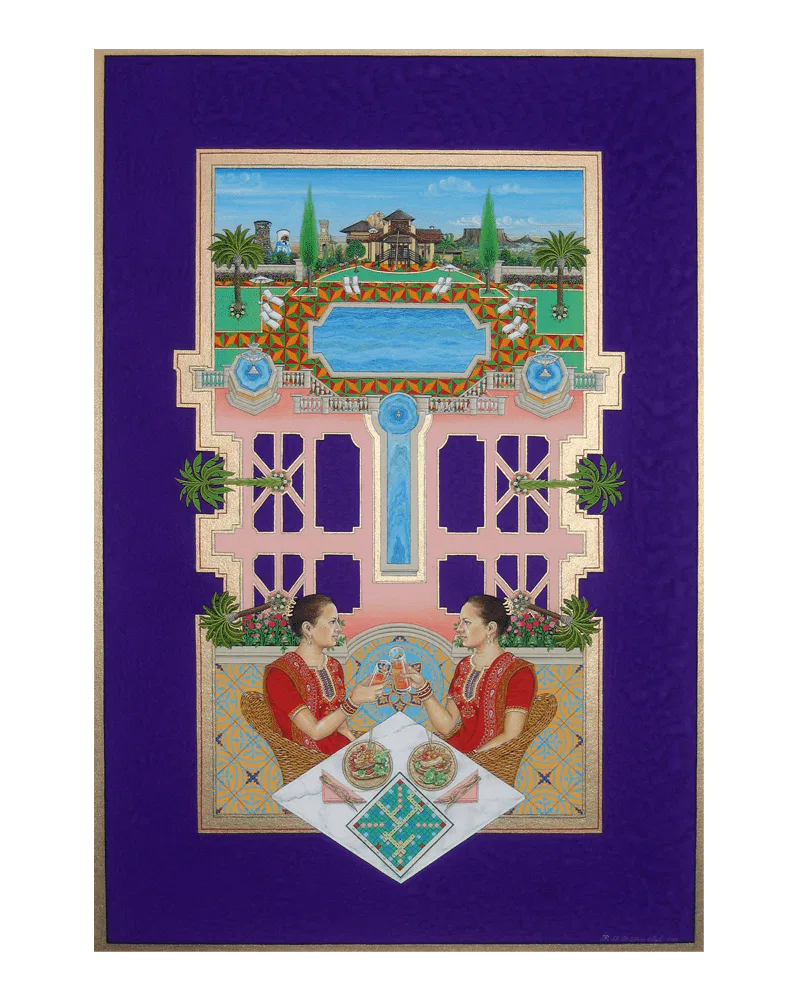 Amrit and Rabindra Kaur Singh, were born in 1966 in London. Often referred to as “The Singh Twins,” the sisters are based in Britain. They have adopted the language of Indian and Persian miniature painting to depict the complex urban and domestic landscapes of the contemporary world. The dual significance of their work lies in their determination to revive the dying tradition of Indian miniature painting whilst contributing to the enrichment and development of the British contemporary art scene. Their art comments on how religious icons have been replaced by secular ones in a materialistic world that, unfortunately, would rather have sports and pop celebrities as role models instead of the spiritual ones offered by world faiths. They had simply followed a long Indian tradition of using historical, symbolic art language to deal with contemporary issues within a secular context. The fusion of Asian and Western influence and their interest in global iconography has generated some fascinating juxtapositions in the Singh Twin’s paintings. The twins have exhibited their work to international audiences in Britain, Europe, India, and North America. Amrit and Rabindra Kaur Singh have received much recognition for their work, most notably, an MBE, Member of the Order of the British Empire, for services to the Indian Miniature Tradition of painting, in 2011.