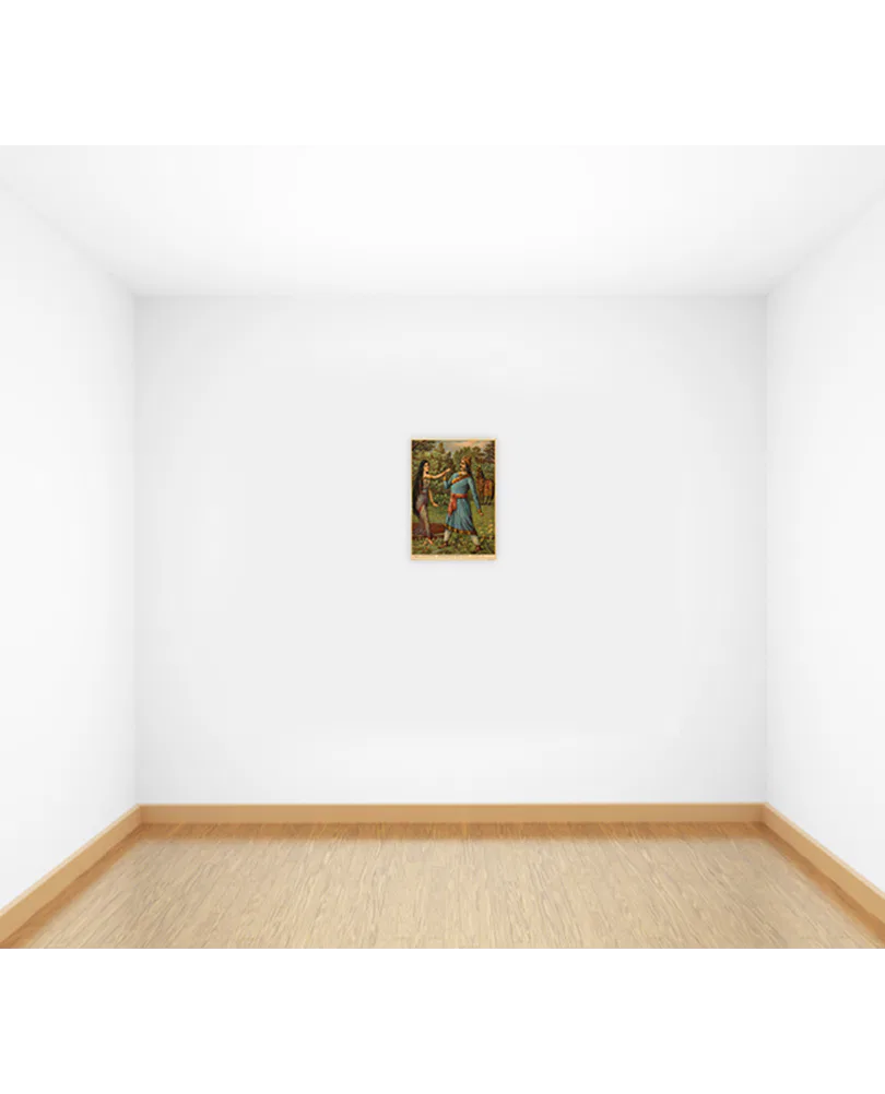 Bamapada Banerjee (1851–1932) received his initial training in painting at the Calcutta Art School but, disillusioned with its pedagogy, he left and took private lessons with Pramathalal Mitra. Subsequently, he worked as an apprentice to the German painter Karl Becker who was then living in Calcutta. He received a prize in an exhibition organized by the Society for the Promotion of Industrial Art in 1879. From 1880 to 1884 he did commissions in Allahabad and Lahore. Bamapada Banerjee’s popularity rests on his paintings illustrating Hindu mythology. He was deeply influenced by the genres of European history painting. Though a junior contemporary of Ravi Varma, the most influential artist of the time, Bamapada evolved an individual style and dominated the popular taste for decades through reproductions of his works, most of which were printed in Germany.